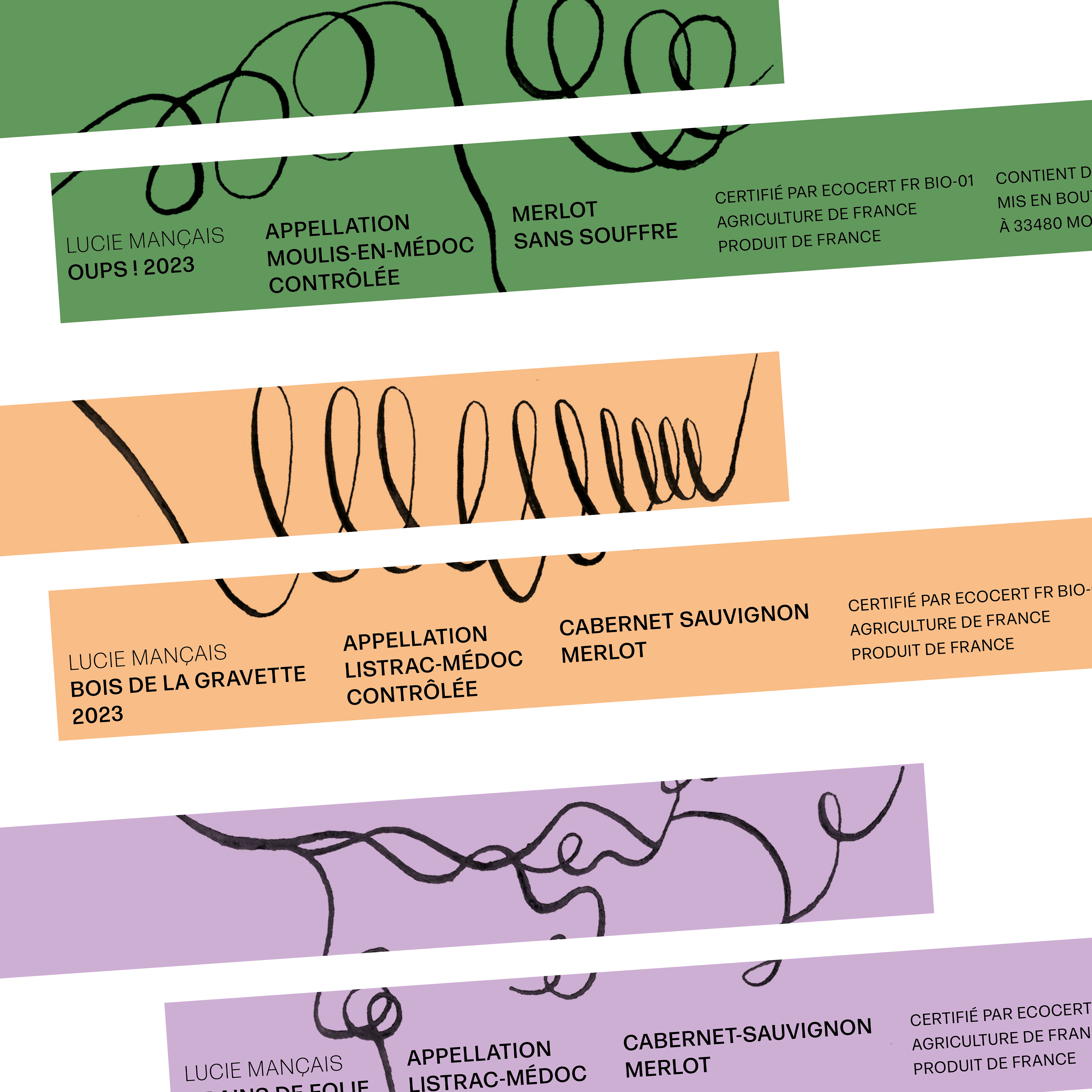 Projet de diplôme de DSAA Typographique de l’École Estienne portant sur la création d’étiquettes de vin inspirée des vrilles de la vigne pour la vigneronne bordelaise Lucie Mançais.